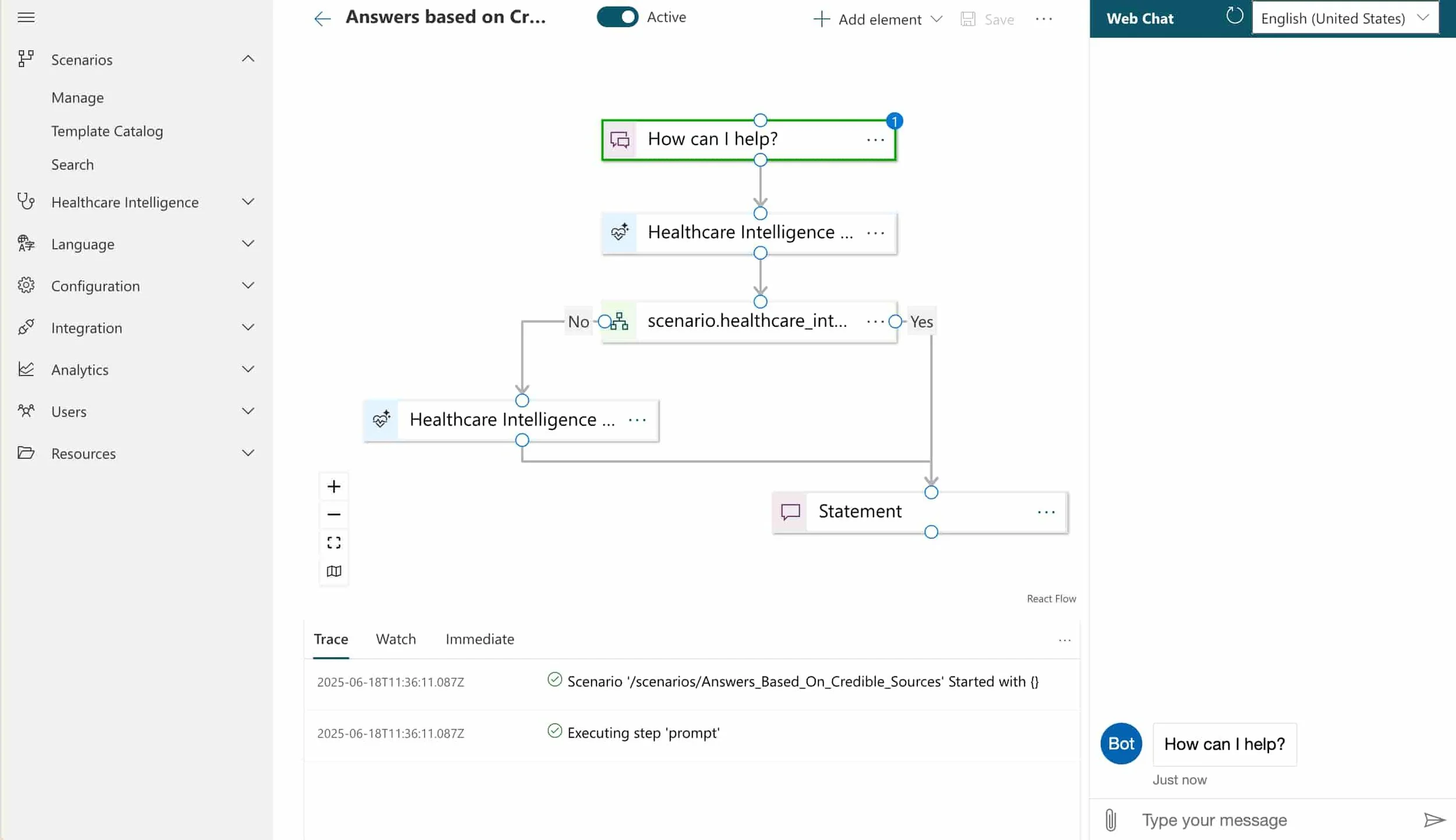 Our Hands-On Experience: Azure Health Bot provides a powerful foundation for intelligent intake, but requires a significant time investment to be understood thoroughly. While it’s possible to prototype without code, developer involvement quickly becomes necessary to unlock its full potential. We’ve worked around limitations in the free tier by spinning up multiple environments for extended testing. Once set up, its pre-built scenarios and smart branching logic streamline clinical workflows at scale.